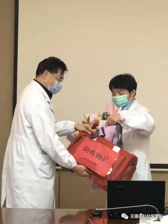 欢送会结束之际,邱东民书记为周杰送上防疫物品,杨亚萍院长为周杰送上鲜花,并合影留念。